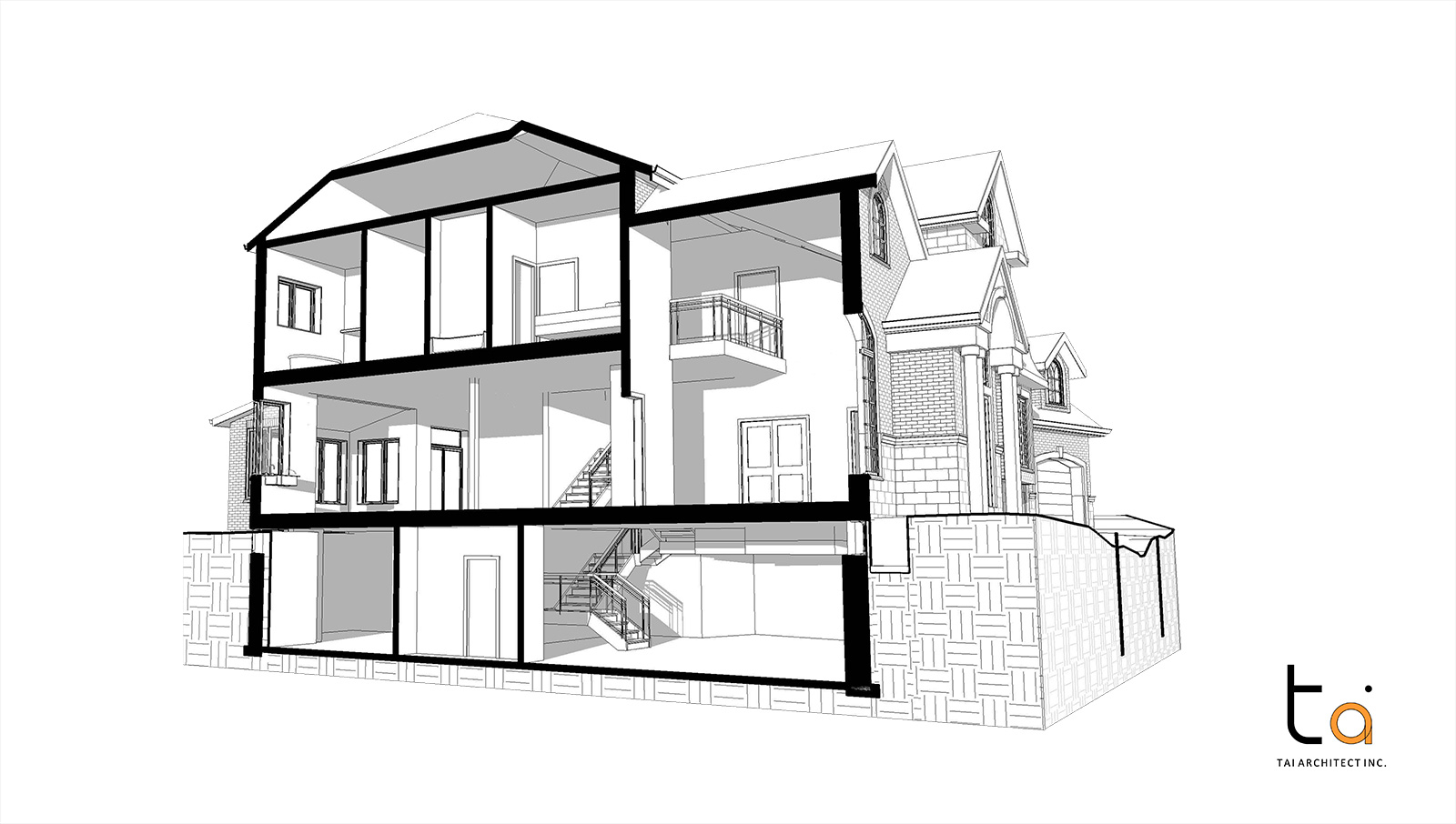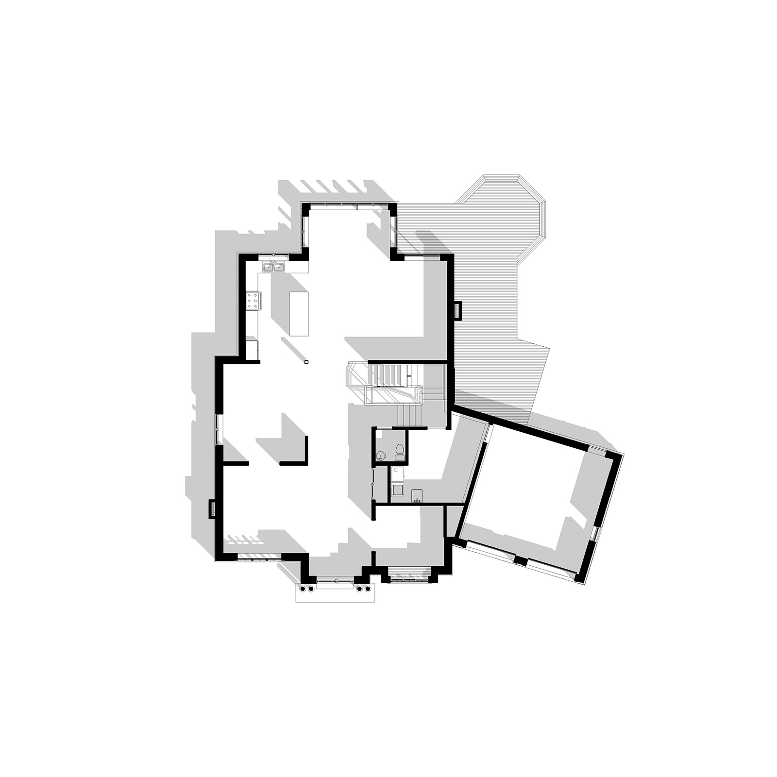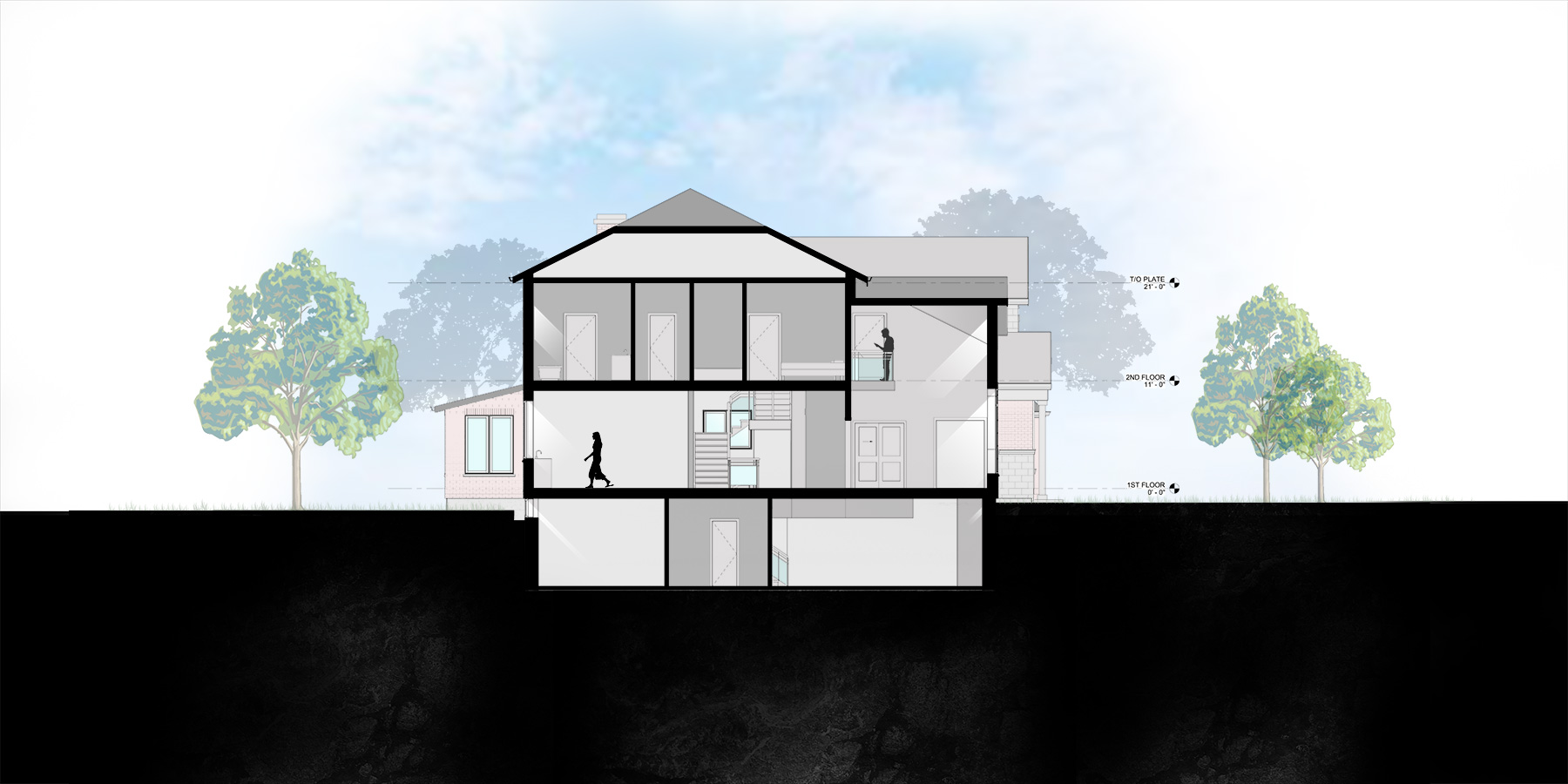 The main building and garage each align with the property of each neighbour to form 2 different axes; visually, it appears similar to a welcome sign. A large second floor balcony and 500 square foot wooden deck extend the limits of the living space and make use of the ample yard while meeting the City’s requirements. All of the trees on the lot have been maintained in the pie shaped lot conducive to backyard gatherings and entertaining.